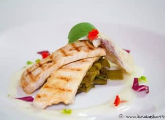 Arista alla senape con peperoncini dolci, chips di radicchio e salsa...