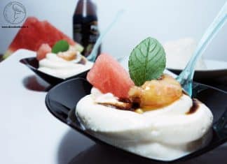 Mousse di ricotta con anguria e gamberetti marinati al balsamico