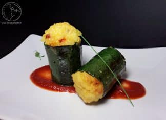 Zucchine ripiene di riso allo zafferano, con pancetta e pomodori secchi