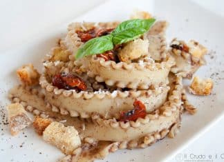 Mafalde con pomodori arrostiti, patè di olive nere, pane al pecorino...