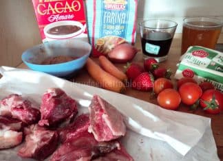 Bocconcini di manzo con salsa al cacao e fragole e pomodorini...