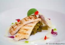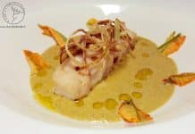 Filetto di merluzzo con porro croccante e salsa di fiori di zucca