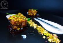 Filetto di maiale in panure di pistacchi con cipolle glassate e crema di fagioli