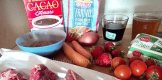 Bocconcini di manzo con salsa al cacao e fragole e pomodorini...