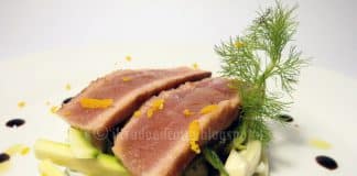 Tonno marinato al balsamico con cruditè di finocchi e zucchine ai...