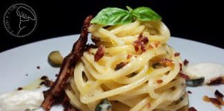 Spaghetti con zucchine, mousse di burrata e pancetta croccante
