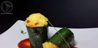 Zucchine ripiene di riso allo zafferano, con pancetta e pomodori secchi